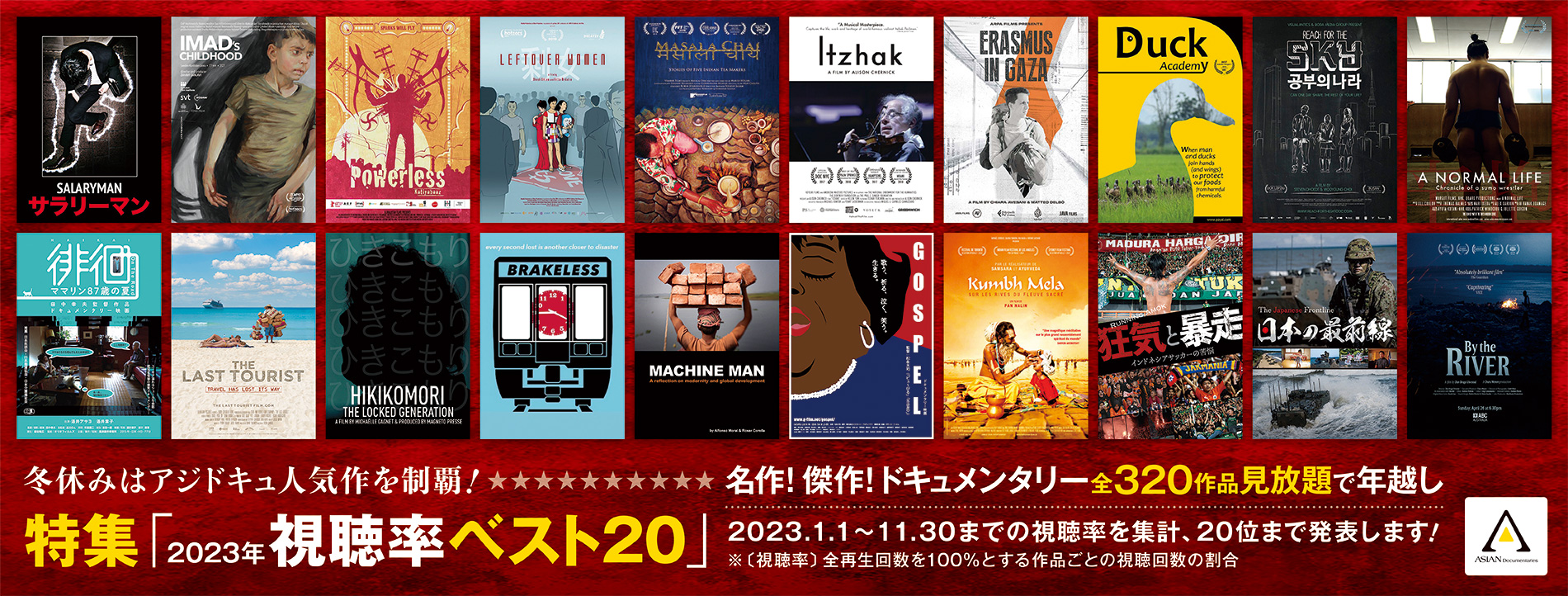 2023年に配信した作品(12月配信開始作品を除く)の中から、視聴率を集計し、ベスト20を発表いたしました。 ベスト20は、自信を持ってお薦めできる傑作、名作が勢ぞろいです。ぜひ、冬休み期間中は、アジアンドキュメンタリーズの人気作品をまとめてご堪能下さい。