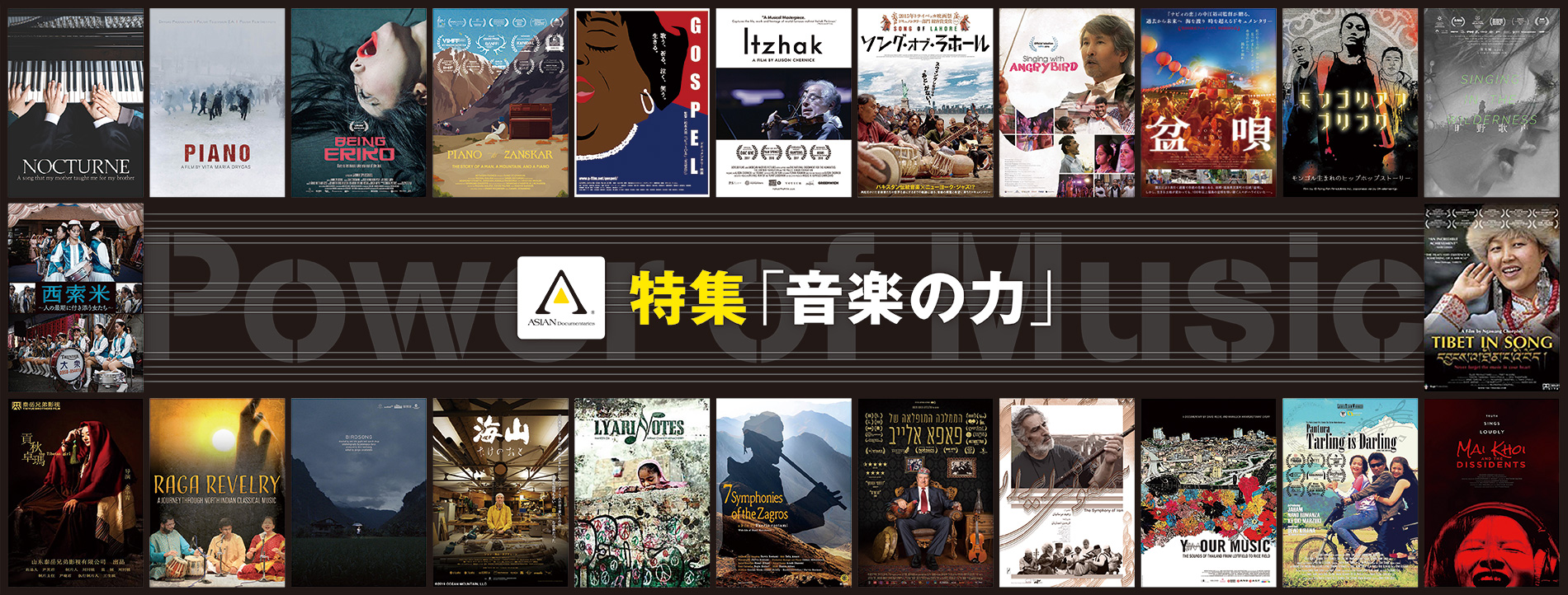 私たちの身の回りは、さまざまな音楽があふれています。テレビ、ラジオ番組のみならず、街中にある多くの店の中でBGMが流れ、好きな曲を聴きたければいつでもスマートフォンで聴くことができます。古来より音楽は、暮らしの中に溶け込んで、私たちの歴史と文化を支えてきました。アジアンドキュメンタリーズのラインナップにも、さまざまな国、ジャンルの音楽を題材にした作品があります。楽しさや芸術性を追求する音楽の中に、それぞれの民族性や時代性、社会背景などを感じ取ることができます。
