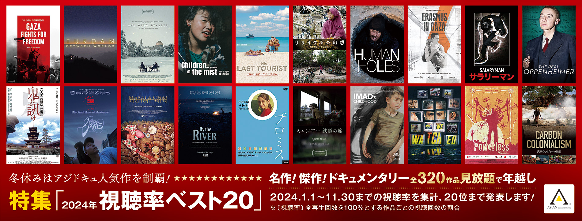 2024年のアジアンドキュメンタリーズ配信作品から、視聴率上位20作を発表します。ランクインした作品群から、この1年がどんな年だったか、視聴者の皆さんが何に関心を寄せているのかを感じ取ることもできます。ドキュメンタリーは世相を映す鏡のような映画です。暴力や人権侵害に憤り、失望することもあれば、見知らぬ世界に足を踏み入れ、知見を広めたり感動を得たりもできます。最新作だけでなく、昨年以前に配信を開始した作品も、根強い人気を誇っています。そして、視聴率が多かった作品は、それぞれに理由があります。その理由とは何だったのかを探りながら鑑賞するのも、視聴スタイルの一つだと私たちは思っています。いずれ劣らぬ名作揃いと自負しております。1年の締めくくりに、視聴者の皆さん自身で選んだドキュメンタリー映画ベスト20を、心ゆくまでお楽しみください。